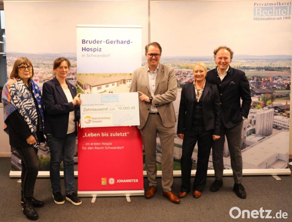 Für den Bau und Betrieb des Bruder-Gerhard-Hospizes in Schwandorf spendet die Privatmolkerei Bechtel 10000 Euro. Damit setzt die Privatmolkerei ein deutliches Zeichen für soziale Verantwortung und regionales Engagement, heißt es in einer Mitteilung. Die Spende erfolgt im Rahmen des karitativen Engagements der Molkerei in der Region Ostbayern. Geschäftsführer René Guhl äußerte sich bei der Spendenübergabe beeindruckt von der wichtigen Arbeit des Hospizes und betonte die Bedeutung lokaler Unterstützung für gemeinnützige Einrichtungen: "Es ist uns eine Herzensangelegenheit, das Bruder-Gerhard-Hospiz der Johanniter in Schwandorf zu fördern. Die wertvolle Arbeit, die hier geleistet wird, verdient unsere Anerkennung und Unterstützung." Das Bruder-Gerhard-Hospiz bietet palliative Pflege und Begleitung für Menschen in ihrer letzten Lebensphase. Sabine Sudler, Sachgebietsleitung Hospize der Johanniter in Ostbayern, nahm den Scheck gemeinsam mit Gisela Pöhler, Vorsitzende des Hospizvereins Stadt und Landkreis Schwandorf, Matthias Walk, bei den Johannitern für Fundraising zuständig, und Gabriele Wittleben, Zweite. Bürgermeisterin von Schwarzenfeld, entgegen. Das Hospiz wird am 5. Januar eröffnet. Am 6. Januar folgt ein Tag der offenen Tür.