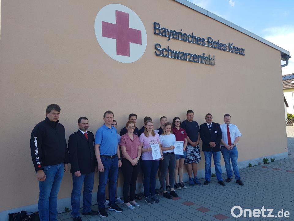 Der BRK-Kreisverband Schwandorf bot einen Grundlehrgang Sanitätsdienst für Feuerwehren und BRK-Bereitschaften an. Der Lehrgang umfasste 62 Unterrichtseinheiten, es ging um die Grundsätze des Sanitätsdienstes, sowie den Umgang mit bewusstlosen Patienten, die Funktionen von Atmung, Herz und Kreislauf, sowie Störungen derselben. Es wurde den Teilnehmern die Erstversorgung von Verletzungen und sonstigen Notfällen gelehrt und die Reanimation im Sanitätsdienst. Die Mimengruppe des BRK Schwandorf stellte Situationen nach, die die Teilnehmer erkennen und "versorgen" mussten. Lehrgangsleiter Christoph Sperl und die Ausbilder Hannah Dahlem, Maximilian Turban und Thomas Eckl konnten gratulierten am Ende des Kurses Maria Schmidbauer, Patrik Hauser, Nicolai Huttner, Manuel Paulus, Sebastian Müller, Josef Müller, Simon Schweizer, Verena Lippert, Michaela Meier, Marina Radlinger und Anton Grabinger aus den BRK Bereitschaften Schwandorf und Burglengenfeld, sowie den Feuerwehren Schmidgaden, Iffelsdorf, Trausnitz, Alletsried, Krondorf-Richt und Unterauerbach zur bestandenen Prüfung.
