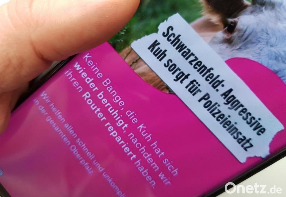 Der ausführliche Artikel vom 4. Dezember, der die oberpfälzischen Jagdszenen recht anschaulich schilderte, wurde viel gelesen und im Internet geteilt. So landete er wohl auch auf dem Schirm einer Kreativ-Agentur, die für die Telekom den Markt beobachtet und Vorschläge für gezielte, regionale Werbung in den sozialen Medien macht. Auf diese Weise kamen vermutlich nicht wenige Facebook-Nutzer in den Genuss einer Werbung in Form einer Facebook-Story mit der einer Zeitungs-Headline nachempfundenen Überschrift: „Schwarzenfeld: Aggressive Kuh sorgt für Polizeieinsatz“.