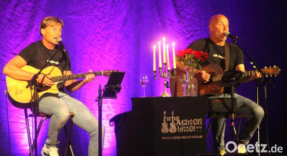 Große Gefühle, Humor und Austropop-Hits: Das Duo „Zwoa Achterl – bitte!“ trat am Samstag vor 350 Zuhörern im Miesberg-Restaurant in Schwarzenfeld mit seinem Programm „Überdosis Gfühl“ auf. In angenehmer Atmosphäre ließen die Musiker das Publikum teilhaben an ihren persönlichen Erinnerungen und präsentierten eine Mischung aus eigenen Songs und Hits der österreichischen Liedermacher Wolfgang Ambros, Jürgen Fendrich und STS.