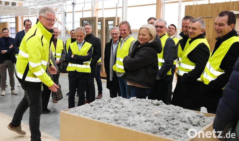 Richard Kurz führte die Gäste durch die neue, 105 Meter lange, 28 Meter breite und zwölf Meter hohe Produktionshalle, das neue Küchenstudio und das Bürogebäude. Der Obermeister der Zimmererinnung nennt Holz den „Baustoff der Zukunft“ und hebt die Vorteile hervor: „Holz schafft ein gesundes Raumklima, spart Energie, überzeugt durch schnelle Bauweise und hat nachhaltigen Nutzen“. Das Unternehmen bezieht das Rohmaterial ausschließlich aus regionalen Waldbeständen. Auch die Wärmedämmung sei nachhaltig, so der Unternehmer. Die Besucher staunten nicht schlecht, als ihnen Richard Kurz erklärte, dass die graue Füllmasse aus altem Zeitungspapier hergestellt werde.