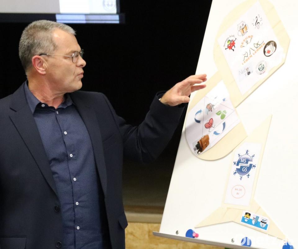 Die Festveranstaltung im Saal der Schule ging genau 100 Tage nach Seeligers Übernahme der Amtsgeschäfte über die Bühne. So wusste der neue Rektor bereits, auf was er sich eingelassen hat, und seine erste Bilanz fiel durchaus positiv aus. „Engagement, Wohlbefinden, Wertschätzung und Leistung“ seien zu bemerken und mit einigen Philosophen und Sozialwissenschaftlern war er der Meinung: „Wir sind auf dem Weg zu einer glücklichen Schule.“ Als wichtig erachtete Seeliger die „digitale Bildung“, damit nicht „Smombies“ durchs Schulhaus laufen. Laut Langenscheidt sind damit Menschen – in diesem Fall: Schüler – gemeint, die durch den ständigen Blick auf ihr Smartphone so stark abgelenkt sind, dass sie ihre Umgebung kaum noch wahrnehmen.