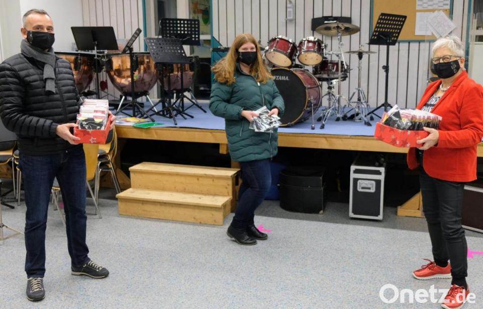 Fördervereinsvorsitzende Inge Bauer-Joswig (rechts) und ihr Stellvertreter Alois Gsödl (links) überreichen an die Vorsitzende der Musikkapelle Schwarzenfeld, Kristina Betz (Mitte) für alle Aktiven der Kapelle Hygieneschutzmasken mit aufgenähtem Violinschlüssel als weihnachtliche Aufmerksamkeit.