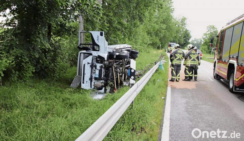 Der Laster war gegen 18 Uhr aus Richtung Stulln auf der Staatsstraße 2151 unterwegs und kam auf relativ gerader Strecke nach rechts von der Fahrbahn ab. Das Fahrzeug walzte die Seitenleitlinien nieder und kippte um.