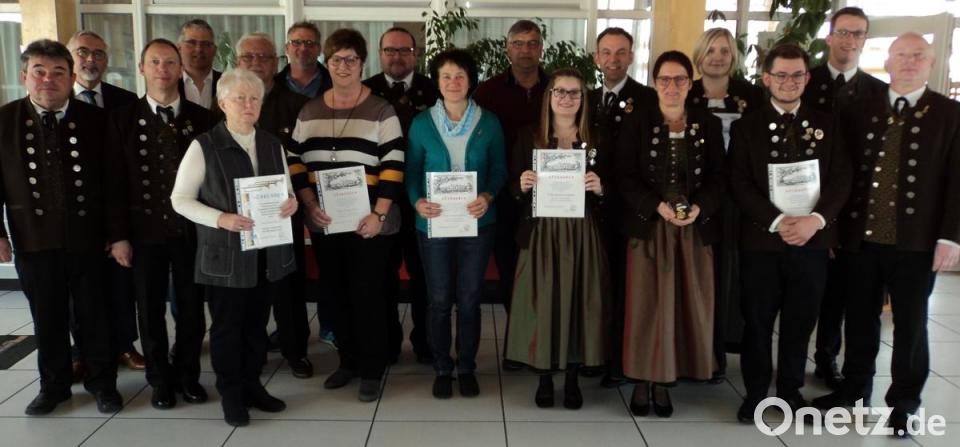Für ihre langjährige Mitgliedschaft im Verein sowie im Nordbayerischen Musikbund gab es Ehrennadel und Urkunden aus den Händen von Bürgermeister Manfred Rodde und Bezirksdirigent Anton Lottner.