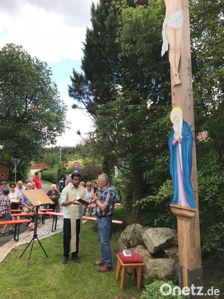 Der Herrgott und die Maria wurden vom gebürtigen Ebnather Gerhard Kainz neu gestaltet. Unterstützt wurde die Aktion durch eine Spende von der Raiffeisenbank Neusorg. Bei der Andacht dankte der Geistliche den Schwarzenreuthern, dass sie dieses Kreuz in Ehren halten und so für einen Platz der Besinnung und des Betens sorgen. Er begrüßte neben einer Reihe von Teilnehmern auch Bürgermeister Peter König. Die Dorfkirwa begann mit einem Vorabendgottesdienst auf dem Dorfplatz vor der Kapelle, zelebriert von Pfarrer Siegfried Wölfel. Anschließend sorgten die "Musicmen" auf dem vollbesetzten Dorfplatz bis in die Nacht hinein für ausgezeichnete Stimmung.