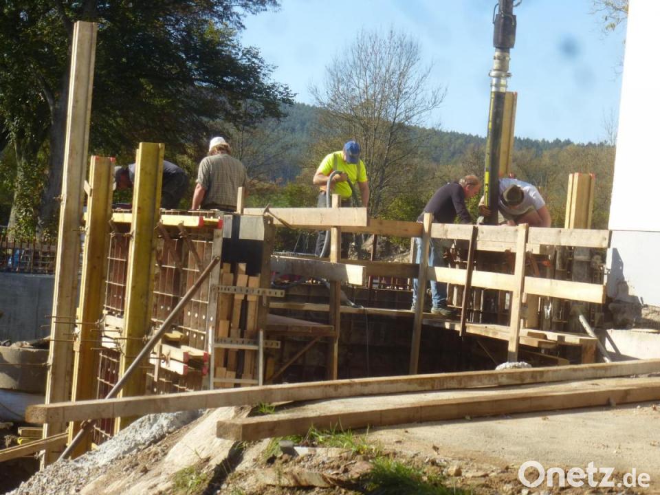 Ein großer Schritt nach vorne wurde beim Bau der neuen Fußgänger- und Radfahrer-Brücke über die Schwarzach gemacht: Nach langen Vorarbeiten wie Schalungsbau und Eisenflechten wurde das nördliche Widerlager der künftigen Brücke betoniert. Eine riesige Pumpe beförderte den Beton aus dem Lastwagen an die Baustelle, wo etliche Arbeiter eifrig am Werk waren, den Beton einzuleiten und zu verdichten.