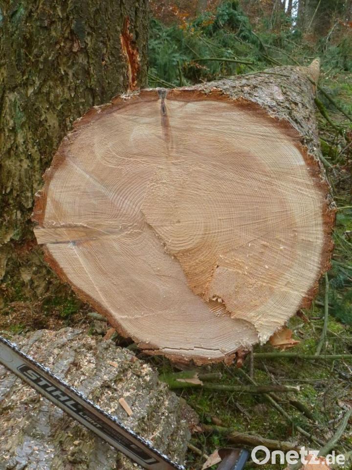 Dieser hat im Wald zwischen Ziegelhof und Katharinenthal große Baumriesen stehen, darunter eben auch mächtige Douglasien, die etwa hundert Jahre alt sind. Mit dem Holz von zwei Bäumen – zwei etwa vier Meter lange Stücke – kann Winderl für die Folgejahre die Produktion seiner beliebten Advents- und Weihnachtsartikel fortsetzen.