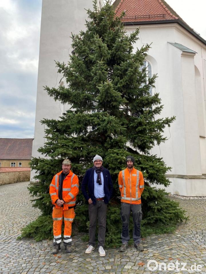 Bürgermeister Maximilian Beer freute sich zusammen mit Anton Köppl und Fabian Winter vom Bauhofteam, dass wieder zwei so schön gewachsene Nadelbäume gespendet worden sind.