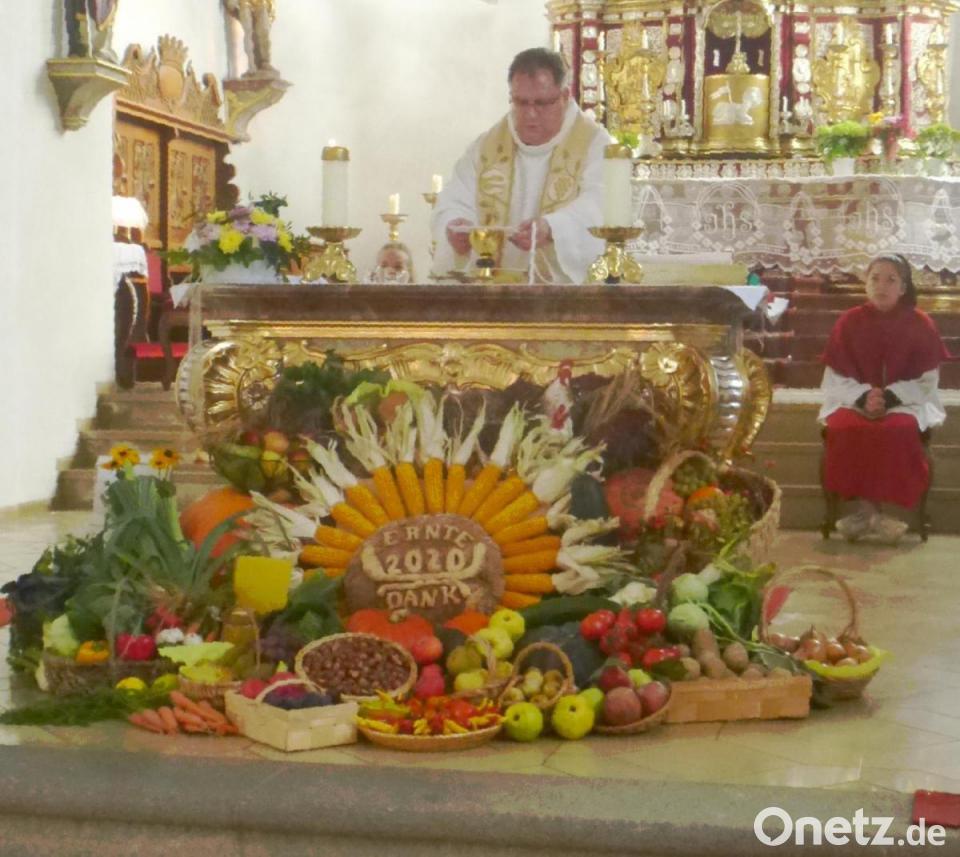 Im Altarraum des Gotteshauses bildeten die verschiedensten Früchte der Erde ein stilvolles Ensemble. Die Gestaltung haben in diesem Jahr die Mitarbeiter des Pfarrdienstes aus Schwarzeneck und Baumhof übernommen. Der Gottesdienst wurde von einer Gesangsgruppe des Kirchenchores gestaltet.