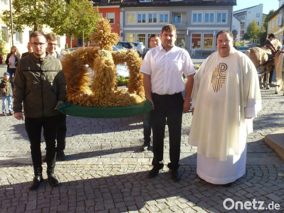 Für den Familiengottesdienst war im Altarraum der Kirche aus den verschiedensten Früchten der Erde ein stilvolles Ensemble erstellt worden. Dabei hatten die Helfer des Pfarrdienstes aus vom Uckersdorf und Girnitz ihre Kreativität spielen lassen. Die Mädchen und Buben aus Kindergarten und Grundschule, ihre Eltern sowie kirchliche Vereine und viele Gläubige versammelten sich zunächst zum Kirchenzug. Dabei wurde die prächtige Erntekrone auf einem festlich geschmückten Kutschwagen der Familie Zimmermann – gezogen von zwei Haflingern – bis zum Marktplatz gefahren. Schließlich trugen vier junge Männer des Pfarrdienstes die Erntekrone in das festlich geschmückte Gotteshaus.