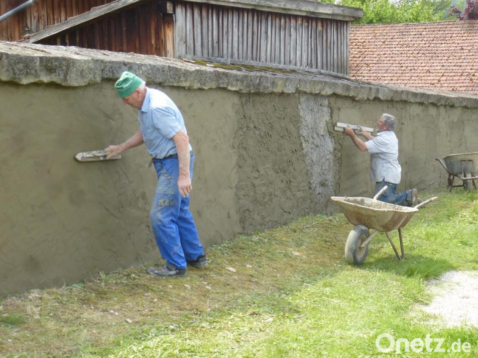 Friedhofsmauer: Freiwillige Helfer tragen neuen Putz auf