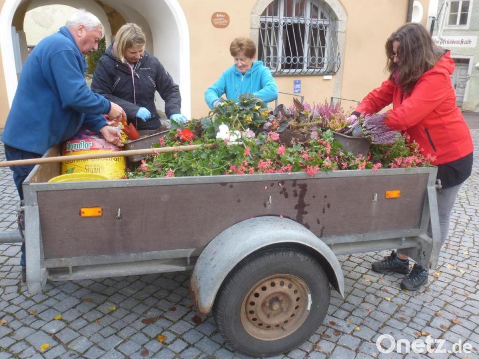 Bei angenehmem Herbstwetter machten sich Aktive des Gartenbau- und Ortsverschönerungsvereins Schwarzhofen mit dem Vorsitzenden Anton Schießl daran, die Sommeranpflanzung am Rathaus und an der Verkehrsinsel bei der Kreuzung nahe der Tankstelle Prey zu entsorgen, da die Jahreszeit doch schon fortgeschritten ist. An den Fenstern des Rathauses wurden die Geranien abgeräumt und entsorgt, die ersten Nachtfröste hatten sie gut überstanden– sie sahen noch recht ansehnlich aus. Dann wurden winterharte Pflanzen im Fenster des Sprechzimmere des Rathauses eingesetzt. Bei der Verkehrsinsel wurde ebenfalls die Sommerbepflanzung abgeräumt und einige Herbstblumen gepflanzt, damit doch noch etwas Farbe in den Markt kommt.