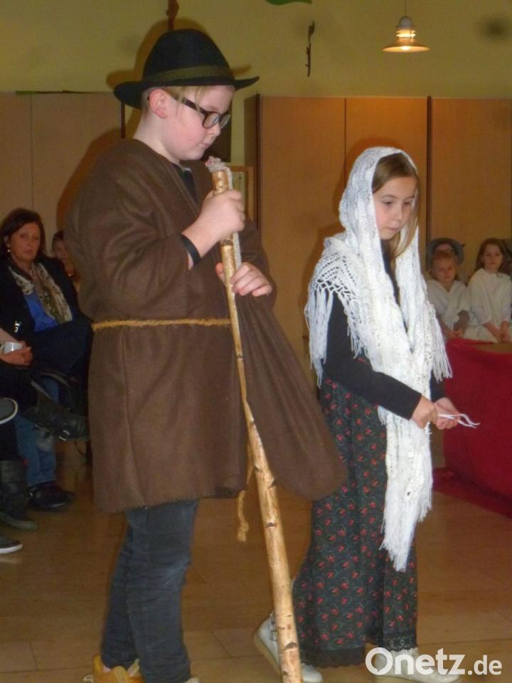 Sogar der "Evangelist Lukas" war dabei und trug in Abschnitten die Weihnachtsgeschichte vor. Die Kinder spielten dann in einigen Szenen diese Geschehnisse nach. Natürlich" waren Maria und Josef dabei im Mittelpunkt, aber auch Engel, Hirten, Soldaten, Wirtsleute und ein Herold traten auf.