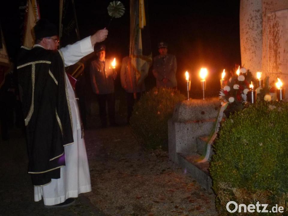 Pfarrer Markus Urban ging im Gottesdienst - der vom Kirchenchor mitgestaltet wurde und bei dem die Vereinsabordnungen präsent waren - schon auf den Gedenktag ein. Am Marktplatz formierte sich danach ein Zug der Vereine und Gruppierungen der Marktgemeinde. Man zog in geschlossener Formation über den "Dientzenhoferweg" zum Kriegerehrenmal beim Friedhof. Die Soldaten- und Kriegerkameradschaft (SuKK) Schwarzhofen hatte neue Fackeln am Kriegerehrenmal postiert und hielt weitere für den Zug bereit.