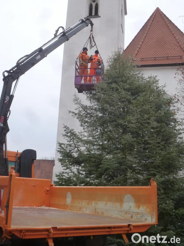 Die Mitarbeiter des Bauhofs übernahmen die Fällung des Baums und den Transport nach Schwarzhofen. In der Vorwoche wurde der Nadelbaum aufgerichtet. Da die Bauhof-Crew seit einigen Jahren über die nötige Maschinen-Ausrüstung verfügt, gelang dies schnell. Danach wurden die Lichterketten am Baum angebracht – per Leiter oder mit Hilfe des Krans am Lastwagen mit Tragekorb. Seit dem ersten Adventsonntag nun erstrahlt der Lichterbaum im Markt-Kern im vollen Glanz.