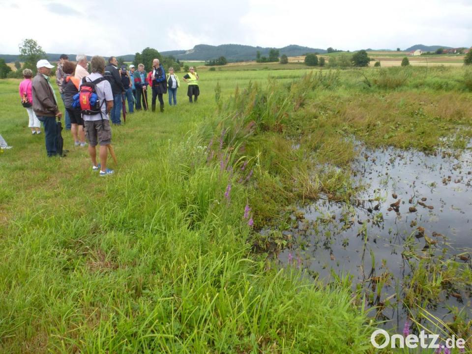 Im Anschluss informierte Maximilian Beer an einer Schautafel über die Schwarzachauen als Fauna-Flora-Habitat(FFH)-Gebiet, einem Schutzgebiet nach EU- Recht, zum Schutz der Wiesenbrüter (wie Kiebitz). Auf dem Weg bekamen die Teilnehmer immer wieder Störche zu sehen, die auf Nahrungssuche waren. Abertausende Grashüpfer in den nach dem Regen feuchten Wiesen waren für sie leichte Beute. Auf dem Weiterweg machte Beer an einem Altwasser auf „Neophyten“ (Pflanzen und Tiere, die früher hier nicht heimisch waren und eingewandert sind) aufmerksam. Vertreter wie Indisches Springkraut oder der Riesenbärlauch würden sich wegen fehlender Fressfeinde rasch vermehren und andere Arten verdrängen.