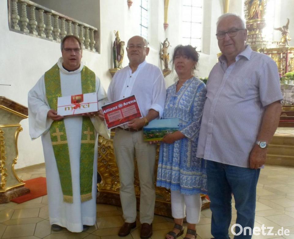 Nach dem Sonntags-Gottesdienst wartete auf den Organisten Adolf Scharf eine Überraschung. Weil er vor kurzem seinen 60. Geburtstag gefeiert hatte, dankte ihm die Pfarrei für seine Dienste – die er übrigens seit 48 Jahren leistet. Pfarrer Markus Urban und Kirchenpfleger Hans Dammer überreichten ihm einen Gutschein, der ihm sicher viel Freude bringen wird: Für ein Spiel des FC Bayern München in der Allianz-Arena nach Wahl für zwei Personen – also auch mit Ehefrau Gabi Scharf, die den Kirchenchor leitet. Pfarrer Urban und Kirchenpfleger Dammer drückten damit ihren Dank für die ehrenamtlichen Leistungen des Organisten aus.