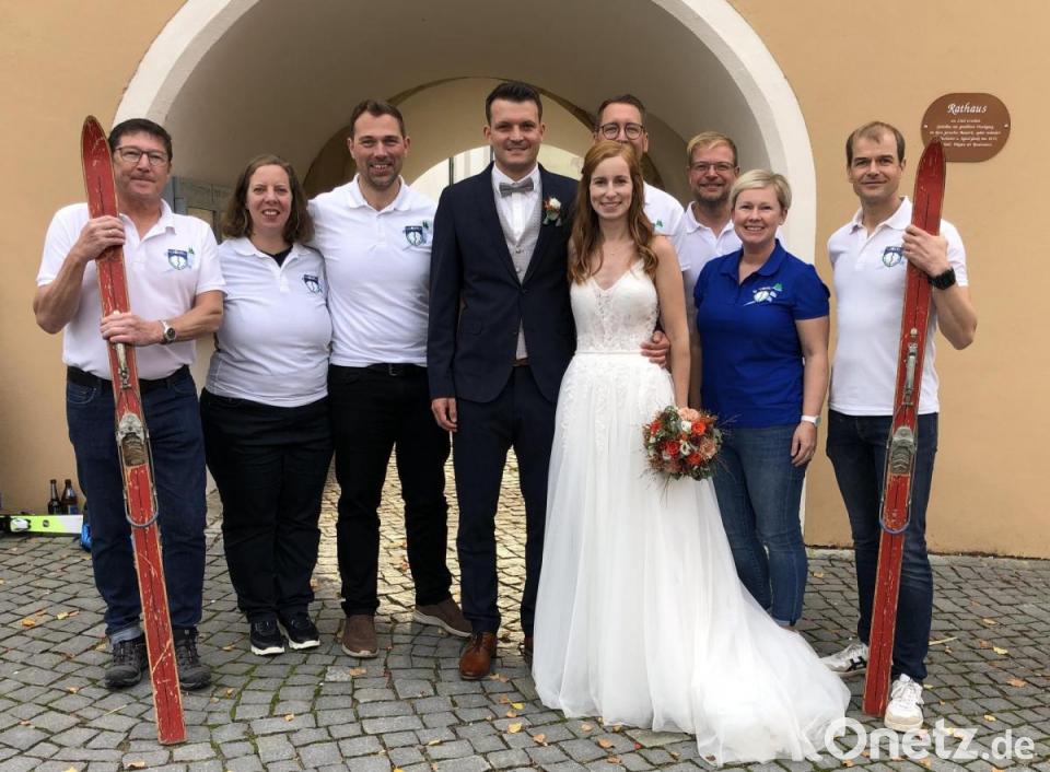 Der Skiclub Neunburg vorm Wald hatte zum Standesamt in Schwarzhofen gleich die Brettl'n mitgebracht, auf denen Julia und Christoph Danner geschmeidig ins Eheglück rutschen sollen.