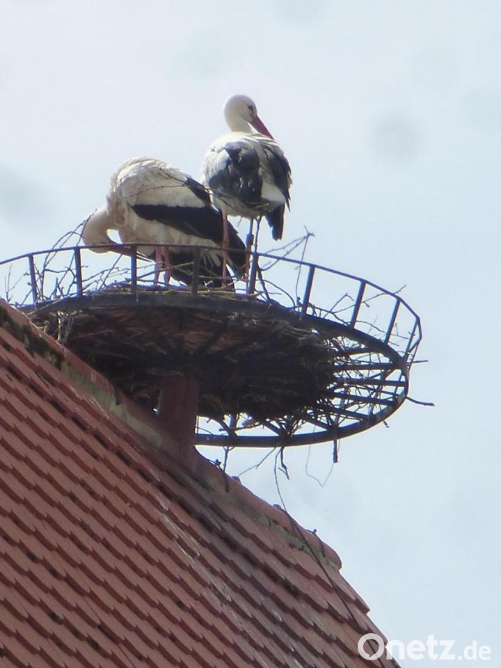 Seit ein paar Tagen sieht man auf dem Kirchendach in Schwarzhofen wieder zwei Störche im alten Nest – zwei Wochen früher als im Vorjahr, als sie tatsächlich nach einer jahrelangen „Pause“ brüteten und zwei Jungstörche aufzogen. Auf den umliegenden Wiesen kann man das Paar bei der Futtersuche beobachten.