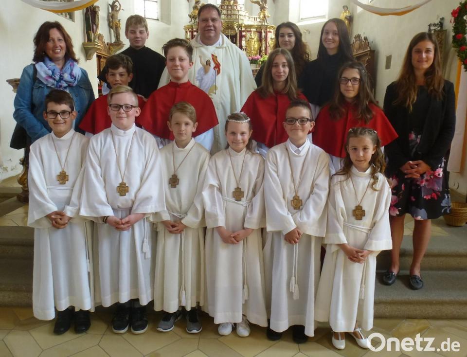 Am Tag der Erstkommunion wurden die Buben und Mädchen von Pfarrer Markus Urban, Rektorin Claudia Buchmann (links), Lehrerin Christine Göckel (rechts) und den Ministranten begleitet. Bild: mad