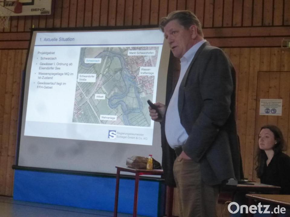 Anton Baumann, Fachstellenleiter beim Wasserwirtschaftsamt Weiden, stellte die Planung vor. Es gehe um die Verbesserung des ökologischen Zustandes der Schwarzach, die Steigerung der Sozialfunktion des Gewässers und einen barrierefreien Zugang. Die Zuständigkeit dazu liegt in der Zuständigkeit des WWA Weiden. Roland Wach vom Regierungs-Baubüro Schlegel stellte dann die ökologischen Ziele, die Belange der Anlieger sowie die wirtschaftliche und sparsame Umsetzung und die Berücksichtigung vor.
