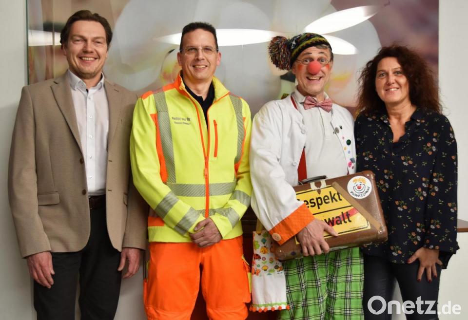 Die Spenden nahmen Thomas Renner, Vorsitzender der Helfer vor Ort, und Klinikclown Professor Dr. Fritzl Fußtapps, bürgerlich Frank Langner, entgegen. Hardy Barth - sein Unternehmen mit den Schwerpunkten EDV, Elektro und Energie beschäftigt gegenwärtig 35 Mitarbeiter - erklärte, statt Weihnachtsgeschenken für die Kundschaft gezielt gemeinnützige Organisationen mit Spenden unterstützen zu wollen. Bei der Auswahl habe er auch regionale Gesichtspunkte im Auge gehabt: Thomas Renner und Frank Langner wohnen beide in Schwend. Die Helfer vor Ort planen, das Geld zur weiteren Ausrüstung von drei neuen Kräften verwenden. Die Auftritte der Klinikclowns, die es seit 1998 gibt, werden vor allem durch Spenden finanziert. Professor Dr. Fritzl Fußtapps ist im sechsten Jahr dabei. Der gelernte KfZ-Mechaniker, inzwischen bei Regens Wagner in Lauterhofen tätig, hat vorher die Clownschule in Bad Kreuznach besucht.