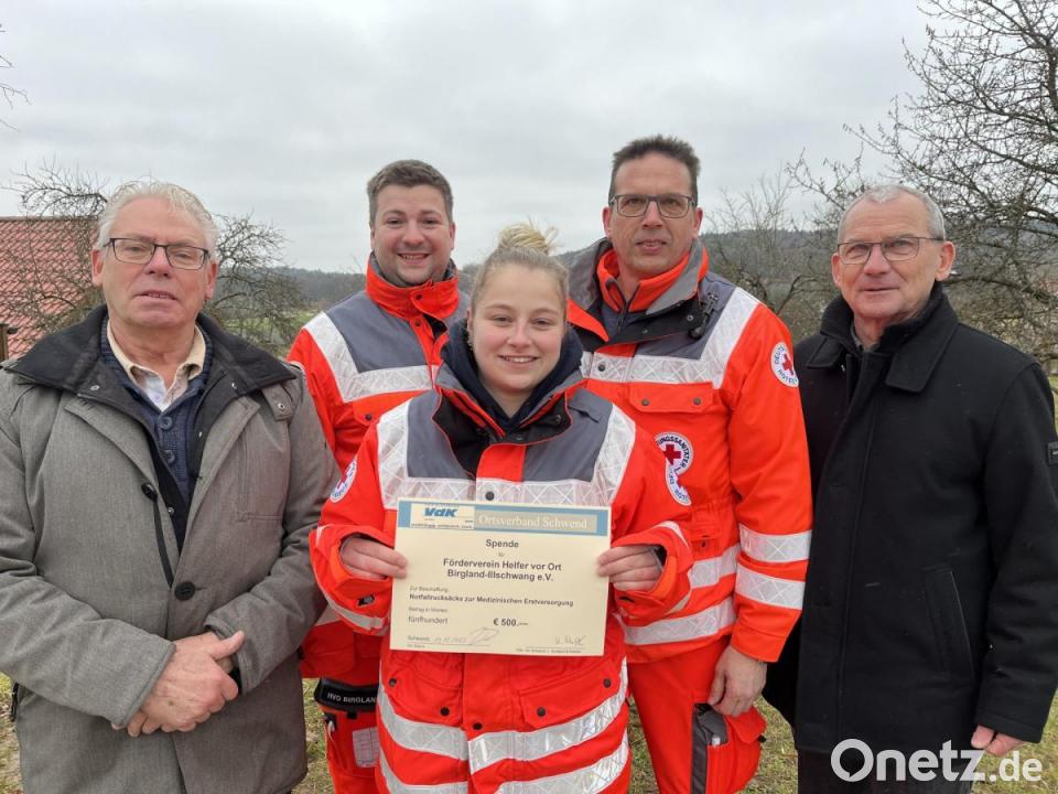 Der Vorstand des VdK-Ortsverbands Schwend hat einstimmig beschlossen, den Förderverein Helfer vor Ort Birgland-Illschwang finanziell zu unterstützen. Der Betrag von 500 Euro ist für die Beschaffung von Notfallrucksäcken zur medizinischen Erstversorgung bestimmt. Vorsitzender Jochen Rackow und Kassier Konrad Schötz überreichten die Spende an Vorstandsmitglieder des Fördervereins der Helfer vor Ort.
