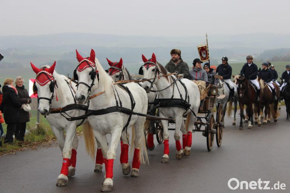 Ross und Reiter, Kutschengespanne sowie viele Gäste versammeln sich alljährlich am ersten Sonntag im November an der kleinen Wallfahrtskirche Sankt Leonhard. Das Gotteshaus wurde 1437 - und damit heuer vor 581 Jahren - geweiht. Der Überlieferung nach stiftete Pfalzgraf Johann das Gotteshaus zum Dank für seinen Sieg über die Hussiten und widmete sie dem Schutzpatron des Viehs, der Pferde und der Gefangenen. Mit Blick auf diese Geschichte, begleiten auch das Pfalzgrafenpaar aus dem "Hussenkrieg"-Festspiel und eine hussitische Fußgruppe seit Jahren die Prozession.
