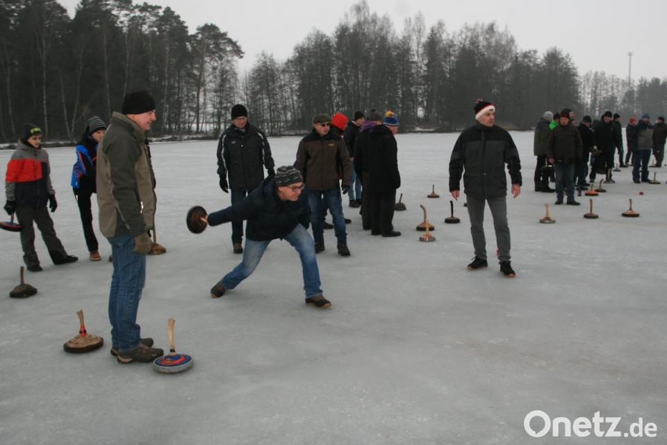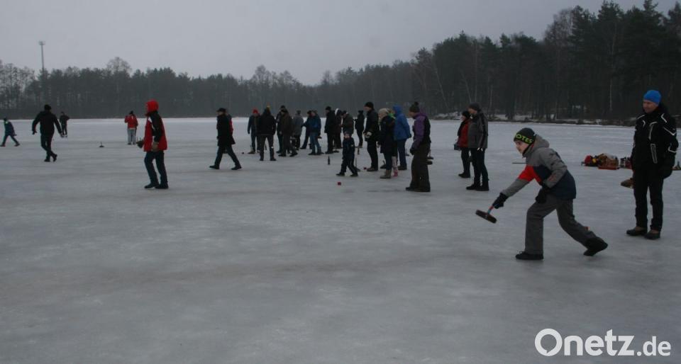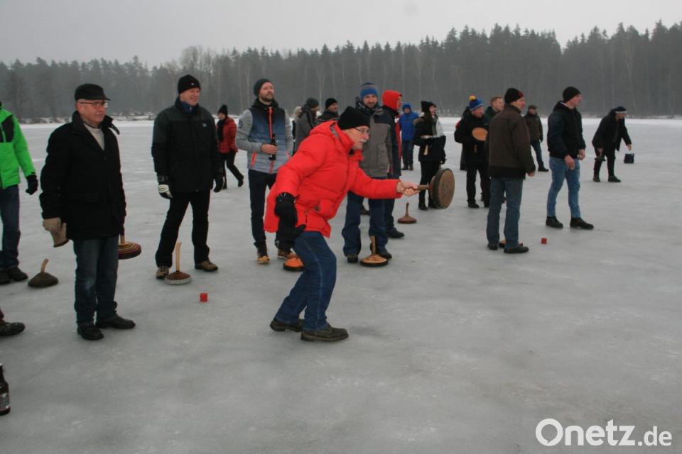 Das war heuer nicht anders als in den vergangenen Jahren. Die Eisfläche war dick genug, um die zahlreichen Teilnehmer aus Falkenberg tragen zu können. Zum winterlichen Eisvergnügen gehörten auch wieder humorvolle Mannschaftsnamen auf der Teilnehmerliste. Angetreten waren unter anderem die „Eisköniginnen“, die zusammen mit den „Eisprinzen“, zudem auch mit den „Eisbären“ und den „Lausboum“, um nur einige Beispiele zu nennen, ihre Kräfte maßen. Einen ganzen Nachmittag lang wurde um Punkte, Zentimeter und um Platzierungen gekämpft. Freilich war auch für die Verpflegung – mitten auf dem Teich – gesorgt. Am Ende wurde zusammengerechnet.