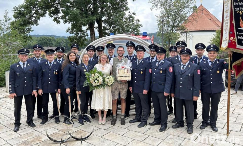 Seit dem Jahr 2020 ist Markus Betz zweiter Vorsitzender der Ortsfeuerwehr und Mitglied im Tiefenbacher Gemeinderat. Conny und Markus Betz sind aktive Mitglieder der örtlichen Feuerwehr, so wunderte es nicht, dass eine stattliche Abordnung nach der Trauung Spalier stand. Vorsitzender Christian Stangl und Kommandant Marco Bittner überreichten einen Blumenstrauß und ein Präsent.