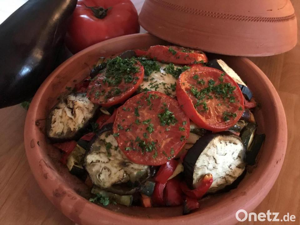 Das Lammfleisch vom Knochen lösen und es in fünf mal fünf Zentimeter große Stücke schneiden. Anschließend reichlich mit Raz-el-Hanout und Olivenöl einreiben. Danach alles mit Zimtstangen für mindestens drei Stunden marinieren. "Das ist auch am Vorabend möglich", sagt OWZ-Küchenchef Michael Schiffer über diesen Arbeitsschritt. Zucchini und Möhren in dicke Stifte schneiden. Die Kartoffeln und die Auberginen in dicke Scheiben schneiden. Knoblauch und Zwiebeln in dünne Scheiben schneiden. Die Paprika putzen, das Weiße entfernen und in Stücke schneiden. Den Ofen auf 180 Grad vorheizen. Nun befüllt man die Tajine der Reihe nach mit folgenden Schichten: Als erstes das Fleisch, dann die Zwiebeln, die Kartoffeln, die Möhren, die Zucchini und die Auberginen. "Zwischendurch würzen Sie alles gut mit Pfeffer, Salz und Raz-el-Hanout", so Schiffer. Lorbeerblätter und Zimtstangen ebenso dazwischen geben.