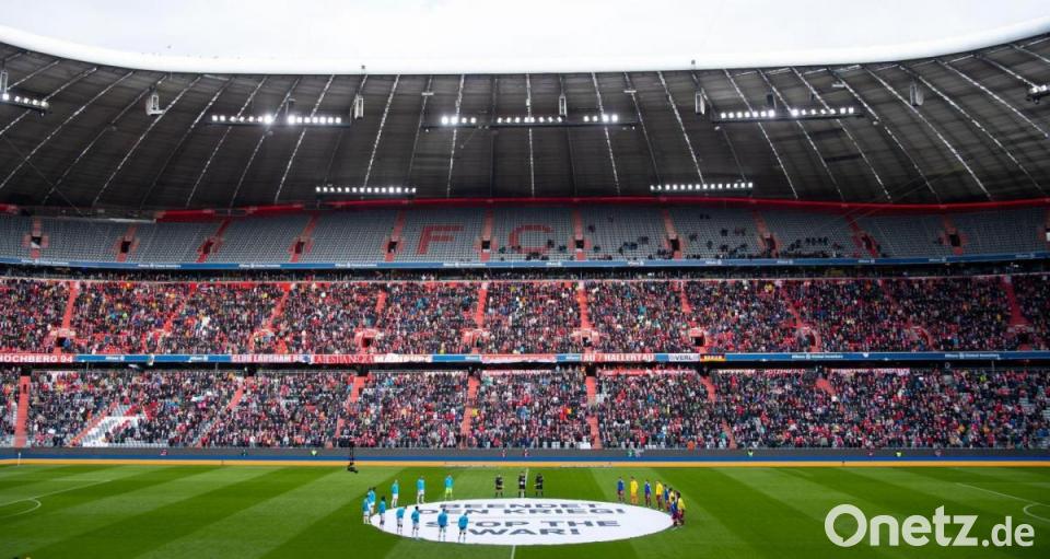 Am zweiten Samstag in Folge haben die Vereine und Fans der Fußball-Bundesliga der Opfer des Kriegs in der Ukraine gedacht. In der Münchner Arena leuchteten die Anzeigetafeln vor der Partie des FC Bayern gegen Bayer Leverkusen in den ukrainischen Nationalfarben Blau und Gelb. Die Spieler versammelten sich kurz vor dem Anpfiff am Mittelkreis um ein Transparent mit der Aufschrift: „Beendet den Krieg! Stop the war!“ Bei der Gedenkminute trugen die Bayern-Profis blaue und gelbe Trainingsjacken.