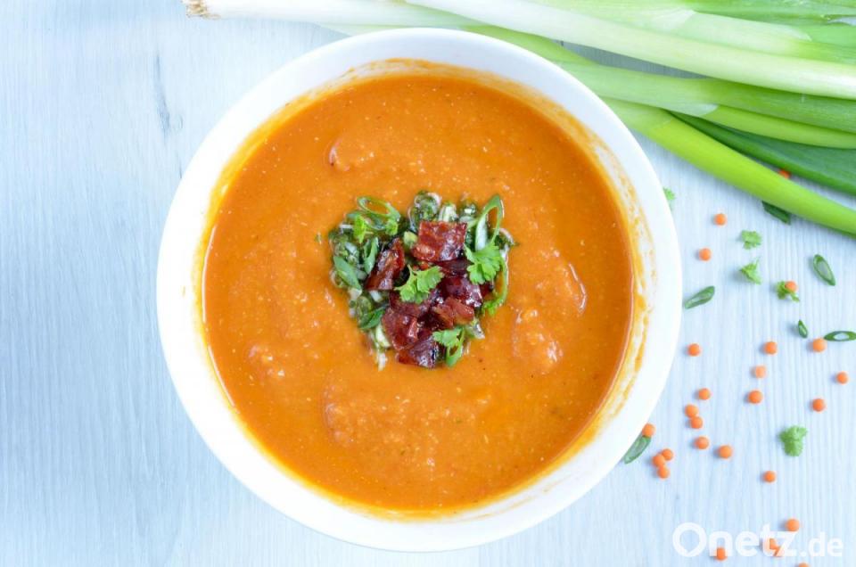 Linsensuppe mal anders: Diese spanische Variante mit roten Linsen und Tomaten überzeugt vor allem durch ihre Beilagen. Das Lauchzwiebel-Relish mit Sherry und Rotweinessig gibt der Linsensuppe einen frischen Geschmackskick, und die kross gebratene spanische Paprika-Wurst Chorizo bringt eine herrliche Würze in die Suppe. Reduziert man die Flüssigkeit, lässt sich die Linsensuppe auch prima als Eintopf zubereiten.