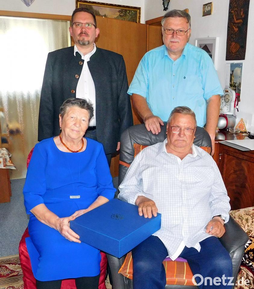 Mit einem hochwertigen Tee-Set, blau verpackt mit bayerischem Staatswappen, gratuliert Ministerpräsident Markus Söder dem Jubelpaar Lenja (83) und Gottlieb Dewald (84) zu 65 gemeinsamen Lebensjahren. Glückwünsche überbrachten persönlich Pfarrer Micha Boerschmann (stehend links) für die evangelische Kirchen- und Bürgermeister Manfred Porsch für die politische Gemeinde.