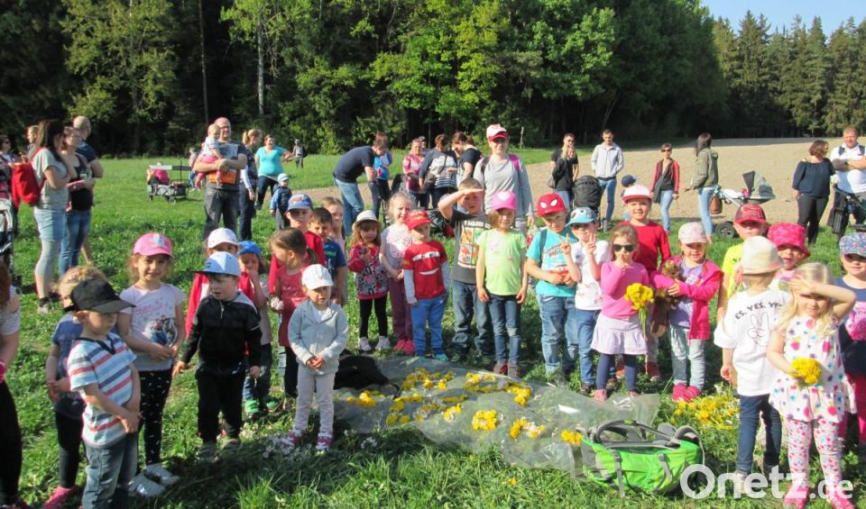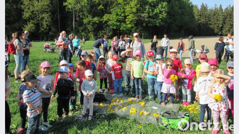 Natur pur erlebten 40 Kinder, Eltern und Großeltern bei einer Wanderung der Kindertagesstätte Sankt Franziskus mit Familienwanderführerin Martina Dötsch. Der Kindergartenförderverein sponserte den Erlebnistag. Mit Rucksack und Proviant bepackt, startete die Gruppe am Ortseingang von Göppmannsbühl. Zwischen Naturweihern mit Wildgänsen und Enten bekamen die Ausflügler auch die Spuren des Bibers zu sehen. Bei einem Picknick gab es Obst und Gemüse sowie als "Dessert" Gummibärchen. Dötsch hatte eine Geschichte vom wasserscheuen Biber Benno mitgebracht. Anschließend ging es weiter. Auf einer Wiese sammelten die Kinder viele Löwenzahnblüten, mit denen die Erwachsenen den Schriftzug "Kita St. Franz." legten. Bis zur Tauritzmühle war es dann nur noch ein Katzensprung. Dort konnten die Mädchen und Buben Sonnen aus Papptellern basteln. Viele Familien nutzten die Gelegenheit der Einkehr in die Wirtsstube. Hier überraschten die Kinder ihre Mamas und Papas mit den im Kindergarten gebastelten Herzen aus Holzscheiben auf rot bemaltem Keilrahmen. Bild: hai