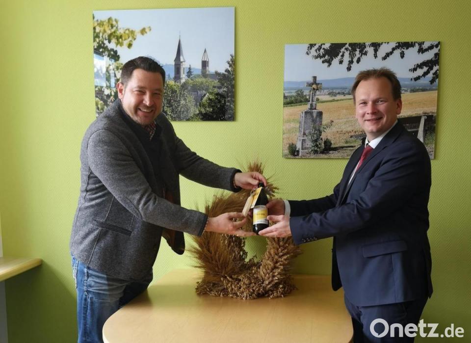 Hobbybrauer Steffen Waris überraschte zur Biergarten-Saison Bürgermeister Christian Porsch mit der ersten Flasche selbst gebrauten Bieres. Die Idee dazu entstand während der Corona-Zeit und aufgrund des Umzugs seiner Familie von München zurück nach Speichersdorf.