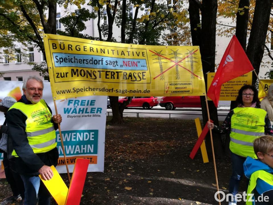 Die Bürgerinitiative (BI) "Speichersdorf sagt nein zur Stromtrasse" bewies bei der Demonstration vor der Staatskanzlei in München ihre Solidarität mit weiteren Gegnern der Süd-Ost-Trasse. An der Kundgebung nahmen BI-Sprecherin Annke Gräbner aus Ramlesreuth und Hans Schmid aus Kirchenlaibach, Vorsitzender der Freien Wähler (FW), teil.