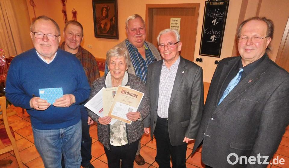 Eine Orchidee, zwei goldene Ehrenmedaillen und drei Ehrenurkunden für 50 Jahre Sängerleben: Der 92-jährigen Anna Hösl (Dritte von links) gratulieren Chorleiter Heinz Schmidt, Gruppenvorsitzender Siegmar Bräutigam, Vorsitzender Hermann Eisenhut, dessen Stellvertreter Gerhard Klein und Wolfgang Köbel (von rechts), der für zehn Jahre als Tenorsänger die Ehrennadel des Fränkischen Sängerbundes in Bronze erhält.