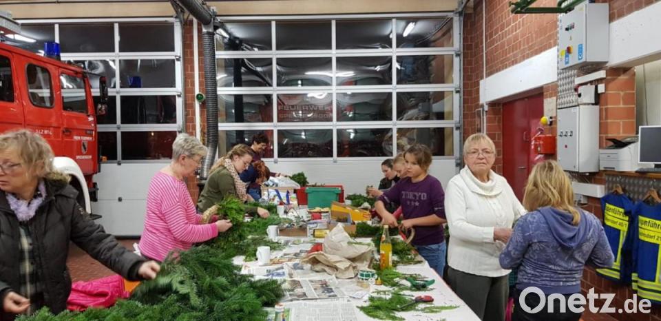 Seit Jahren ergreift dafür Carola Dorsch von den Feuerwehrfrauen die Intiative für den gemütlichen Abend bei Glühwein und Lebkuchen. Drei Stunden lang wurde mit künstlerischer Kreativität geschnipselt, geklebt, mit Fäden und Bändern gebunden. Jeder dürfte sein Material selbst mitbringen. Mit Dekomaterial wie Schleifen, Orangenschalen, Tannenzapfen, Sterne, Engel und Zimtstangen wurde geschmückt und schließlich wurden Kerzen in unterschiedlichsten Formen und Farben aufgesteckt. Wer wollte, konnte sich sein Kunstwerk nach verschiedenen Vorlagen basteln. Heidi Lauterbach und Katja Sehnke nutzten die Gelegenheit, den Adventskranz für die evangelische Christuskirche mit zu fertigen.