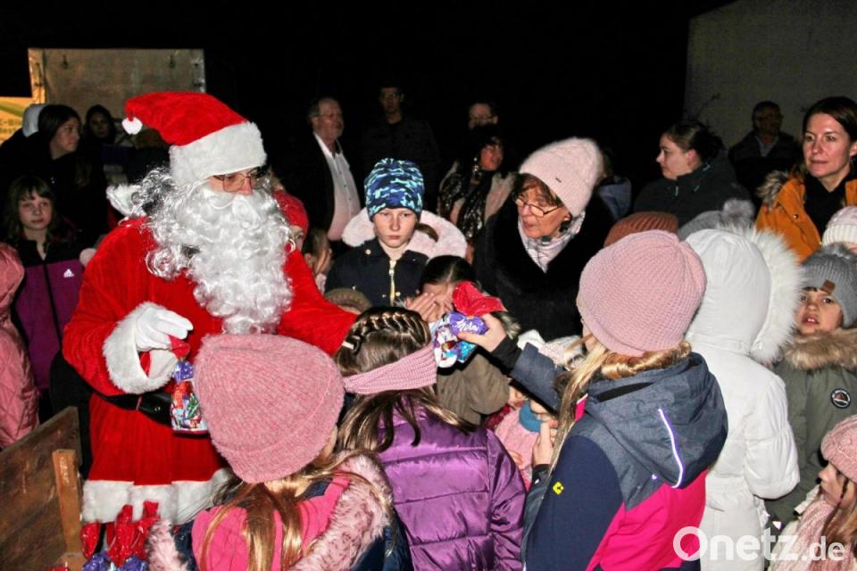 Im Schein des Lagerfeuers wartete schließlich unter der Linde Sankt Nikolaus auf die strahlenden Kinderaugen. Von der Ladefläche eines passenderweise feuerroten Traktors verteilte er Weihnachtspäckchen. Der Traktor war dann natürlich auch ein willkommenes Motiv für ein Fotoshooting der Kinder und Eltern zusammen mit dem heiligen Mann.