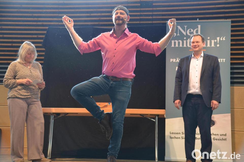 Los ging es mit dem Anruf einer vermeintlichen Polizistin, die den Hausbesitzer vor einem Einbruch in seiner Straße und auch bald bei ihm warnte. Zu dem Betrugsbeispiel aus dem Bereich „Callcenterbetrug“ klärte die Kripobeamtin auf. Meist werde aus dem Ausland mit der Anzeige einer deutschen Telefonnummer angerufen, die Angerufenen würden auf eine falsche Fährte gelockt. „Einfach auflegen und bei der Polizei anrufen“, riet Füßmann. Die meisten Betrugsmaschen blieben zwar im Versuch stecken, viele würden jedoch nicht angezeigt. Bauer intonierte dazu das Lied „Einfach Hörer einhänga“ und forderte den Saal zum Mitschunkeln auf.