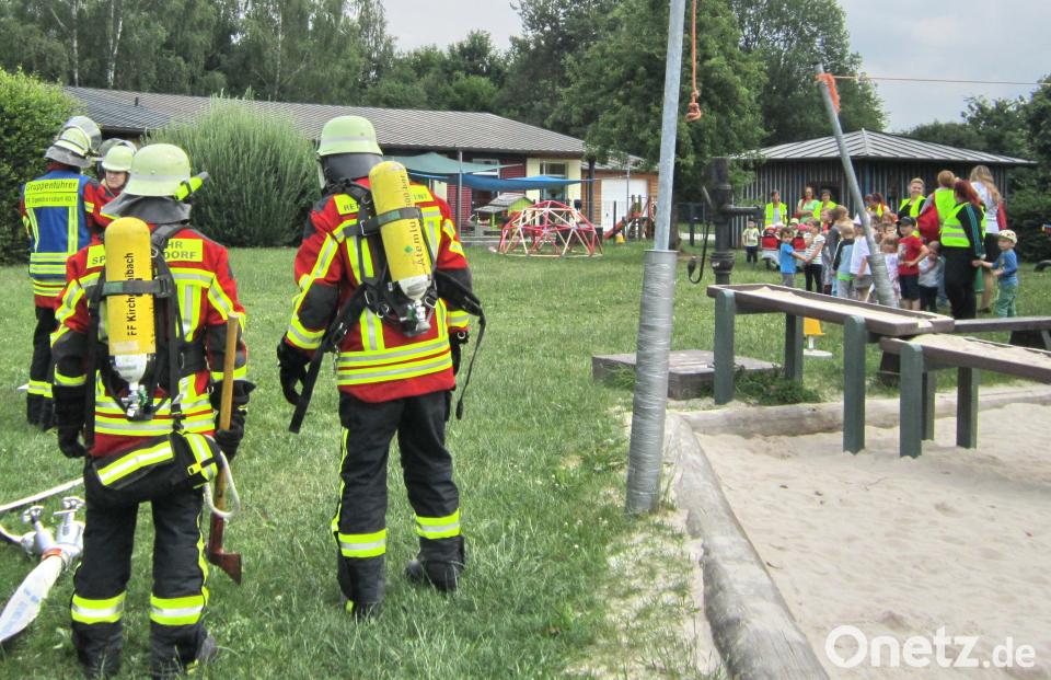 Für alle Kinder war es ein großer Spaß, Pfau mit seinen Sicherheitsstiefeln mal so richtig auf die Füße zu treten, zu zweit in seine große Jacke zu schlüpfen und auch mal einen Blick durch die Maske zu werfen. Am dritten Tag rückte noch ein fünfköpfiger Trupp an. Vorsitzender Sebastian Koch hatte als Gruppenleiter die Einsatzleitung übernommen. Unter den kritischen Augen von Kreisbrandmeister Karl-Heinz Sehnke, Christina Jäger und den Speichersdorfer Kameraden unter Leitung von Sebastian Koch lief eine Räumungsübung der Kindertagesstätte ab. "Vorbildlich", meinte anschließend Christina Jäger. Danach wurde noch mit den Mädchen und Buben der Garten "gelöscht". Tobias Krodel, Andre Hofmann, Sina Graser und Patrick Pfau bauten für sie einen Löschwasserangriff auf. "Die Kinder waren natürlich begeistert", berichtete Leiterin Sabine Pöllath.