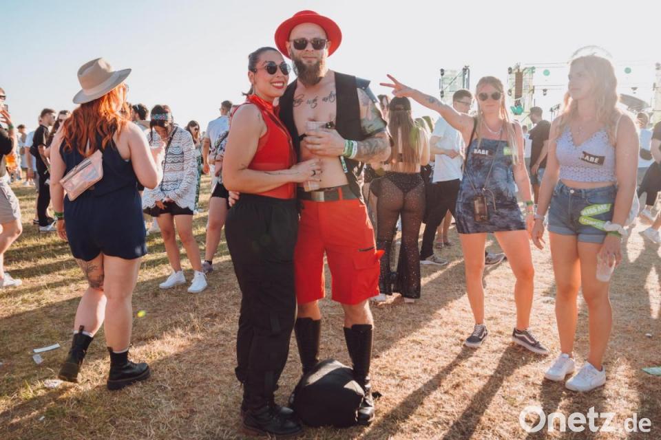 Laura Seyferth aus Kemnath findet es "voll cool" am Open-Air in der Nähe ihres Heimatortes. Sie und ihr Begleiter Florian Kreisel haben sich dafür aufwendig in Schale geworfen. Sie tragen zusammenpassende rot-schwarze Festivaloutfits. "Wir suchen uns jedes Jahr ein neues Outfit aus, extra fürs Kindheitstraumfestival. Dafür holen wir uns Inspiration aus dem Internet", erzählt Florian. Auch viele andere Besucher tragen auffällige Festivaloutfits - Glitzerröcke und bunte Hemden sowie auffällige Sonnenbrillen.