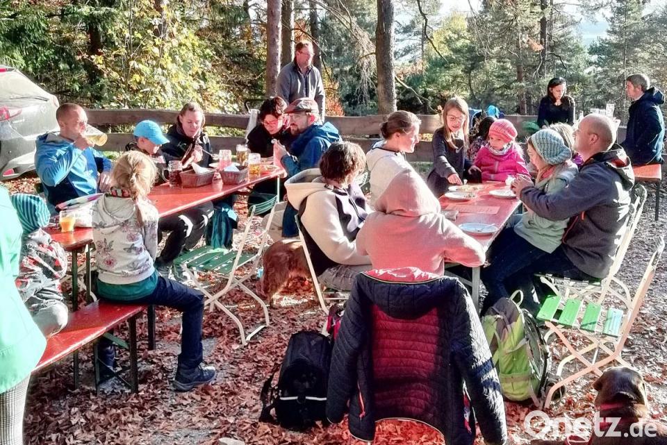 Dötsch hatte sich für die Route wieder Überraschungen überlegt, um auch die weniger spektakulären Feldwege interessant zu gestalten. An der Gänskopfhütte angekommen, genoss die Gruppe noch die letzten Sonnenstrahlen. Bei Kaffee, Kuchen und Brotzeit entspannten sich die fleißigen Wanderer. Die Kinder nutzten die Gelegenheit, den Wald beim Klettern und Spielen zu erobern.