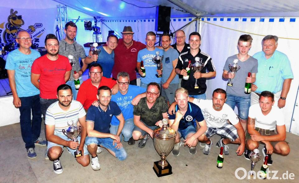 Triumphierender und strahlender Sieger und Gewinner des zum 36. Mal ausgespielten Adam-Gmeiner-Gedächtnis-Pokals: der Schmidtie Stammtisch um Lui Geisler (stehend fünfter von links) im Kreis seines Teams und der Mannschaftscoaches kniiend von links Hasan Özgan, Stefan Reichl, Frank Schmeissner, Bernhard und Norbert Nickl, Kevin Klose, Jens Brunner, Patrick Pfau, stehend von links Harald Zimmermann, Hakan Özgan, Markus Kauper, Christian Porsch, Lui Geisler, Michael Nerlich, Fabian Nickl, Wolfgang Beach Nickl, Christoph Lehner und Michael Walter. Mit im Bild Turnierorganisator Harald Zimmermann (links) und TSV-Vorsitzender Manfred Porsch