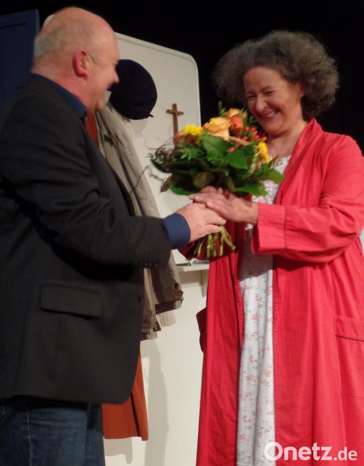 Als Dank für den beeindruckenden Theaterabend überreichte der Leiter des Seniorenwohn- und Pflegeheims, Gerhard Wolf, an die Schauspielerin einen Blumenstrauß. Gleichzeitig nutzte er die Gelegenheit über die positiven Veränderungen sowie dem vielfältigen Angebot insbesondere auf dem Gebiet der Kurzzeitpflege in der Pflegeeinrichtung zu informieren.