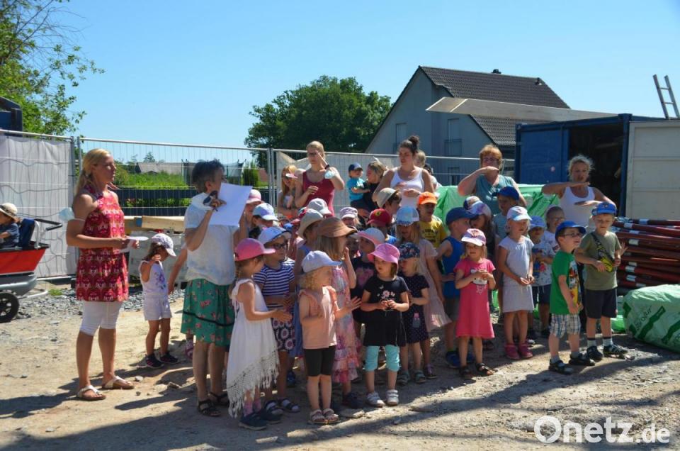 "Die Kinder mit ihren Erzieherinnen und Handwerker sind die Wichtigsten heute. Wir feiern heute mit viel Freude das Richtfest für eure neuen Kinderkrippenräume." Mit diesen Worten eröffnete Bürgermeister Christian Porsch den kurzen, aber feierlichen öffentlichen Teil des Richtfestes zum Anbau der Kindertagesstätte Birkenweg. "Wer will fleißige Handwerker seh'n, der muss zu uns Kindern geh'n, Stein auf Stein, dann woll'n wir dann bald fertig sein", intonierten die Kindergartenkinder, die für ihre Darbietung Gummibärchen erhielten.