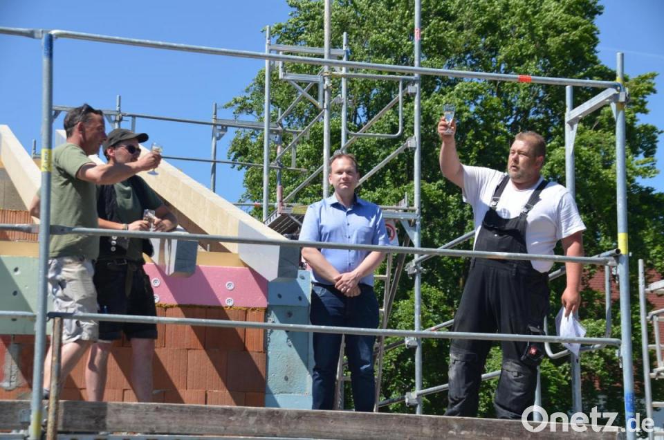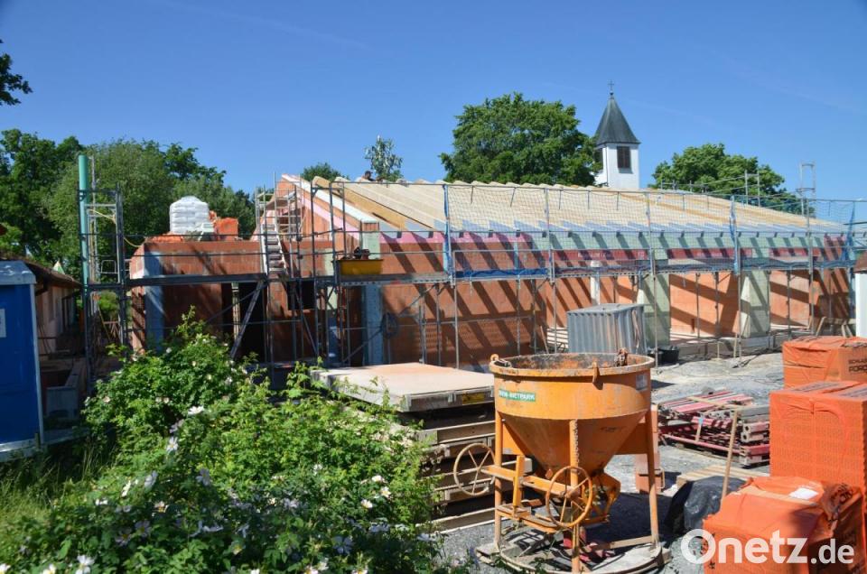 "Wir sehen hier einen weiteren Meilenstein für unsere Kinder wachsen. Die gute Nachricht ist: Wir haben für dieses Projekt keine Nachschubprobleme beim Baumaterial. Für alle weiteren Folgegewerke liegen Angebote vor, die wir in der nächsten Ratssitzung vergeben können. Es geht ohne Pause weiter", teilte Porsch mit. Ziel der Gemeinde ist es, dass die in den vor der Kita aufgestellten Containern untergebrachten Kinder zum Jahresbeginn 2022 in die neu geschaffenen Räume umziehen. Die leer werdenden Container werden anschließend vom Kindergarten Krabbelkiste in der Breslauer Straße mit Leben gefüllt. Mit dem 1,1 Millionen Euro teuren Neubau entstehen zwölf neue Krippenplätze.