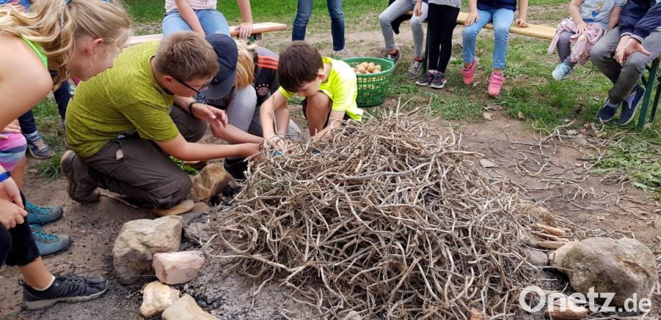 Die Idee dazu hatte Familienwanderführerin Martina Dötsch, liegen die Kartoffelfelder der Familie Brunner direkt vor der Haustüre der Tauritzmühle. Da die Tochter des Landwirts eine der Betreuerinnen der Kindergruppe der Landjugend Haidenaab-Göppmannsbühl ist, wurden für diese Veranstaltung beide Gruppen zusammengelegt. Als Brennmaterial diente Kartoffelkraut vom abgeernteten Acker. Nach einer Belehrung, was beim Umgang mit Feuer alles zu beachten ist, durften die Kinder das erste Kartoffelkraut auf die Feuerstelle legen und unter Aufsicht entzünden. Als nur noch die Glut übrig blieb, war es Zeit für die Kartoffeln. Diese hatten die Mädchen und Buben in Alufolie eingewickelt, damit sie vor Asche und Rauch geschützt waren. Nach etwa 20 Minuten waren sie gar. Bei den Kleinsten halfen die Betreuer beim Entfernen der Folie.